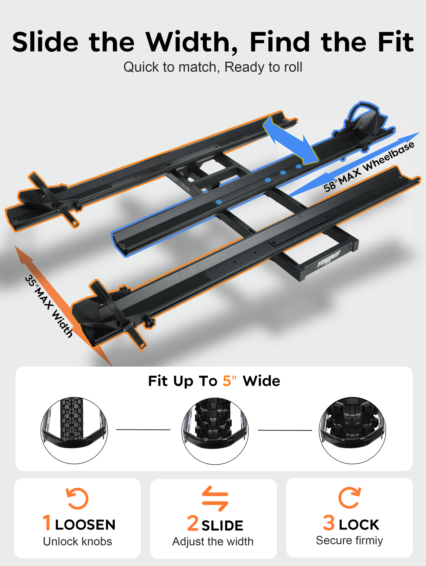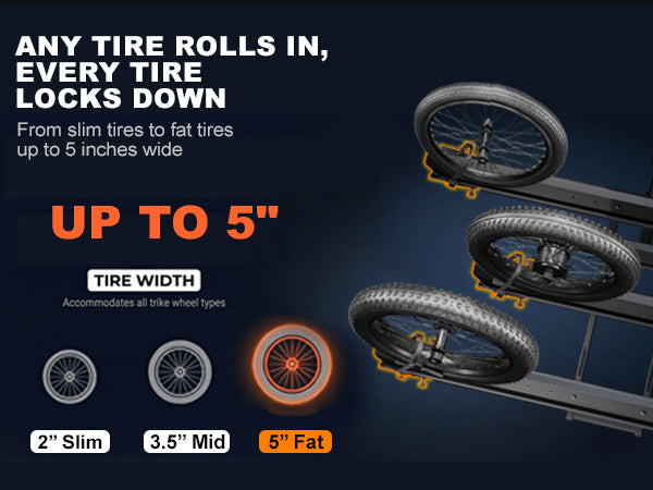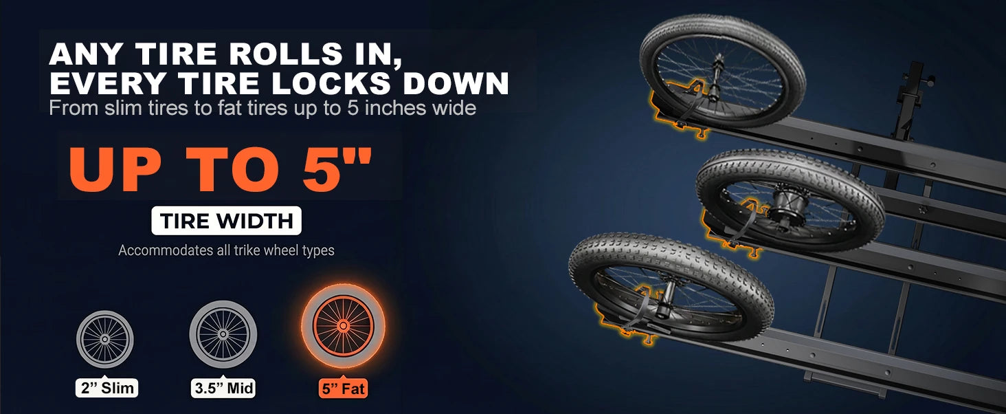 Fully Adjustable & Anti-Slip Fixation -- The etrike rack for car features adjustable wheel cradles to fit various wheel sizes and fat tire trikes. Equipped with sturdy 3-point tie-down straps to tightly secure tires in place, effectively eliminating sway, shaking and shifting during driving for safe and stable transportation.