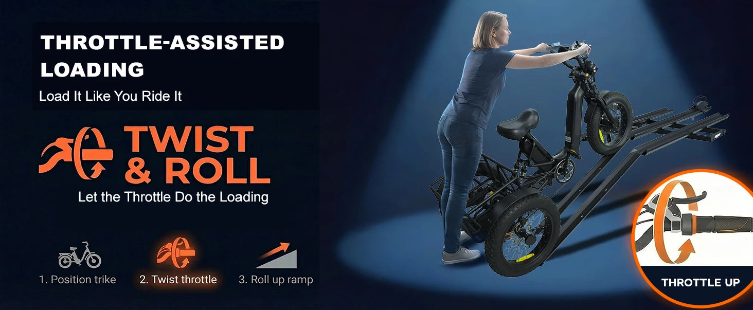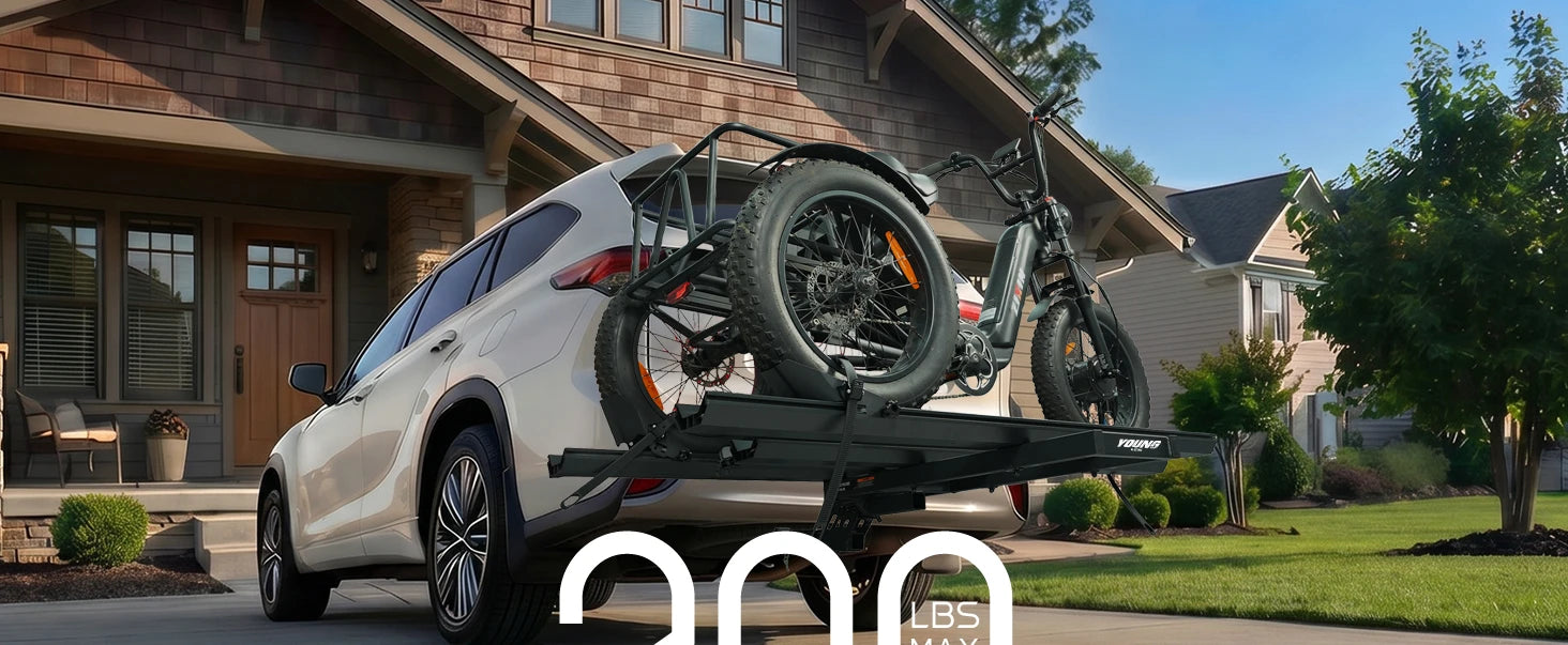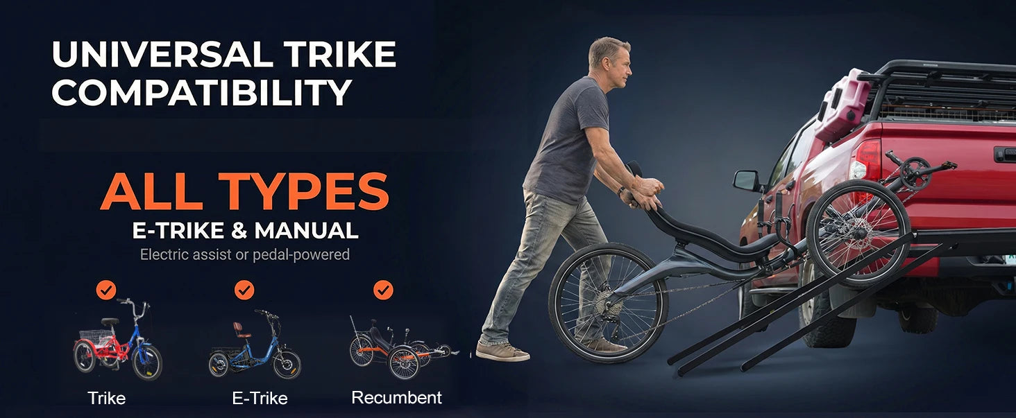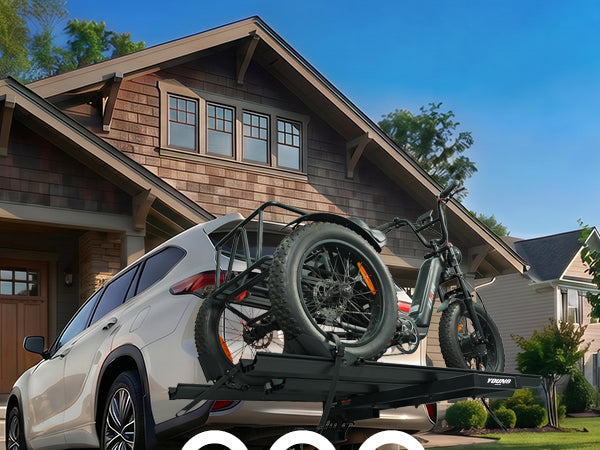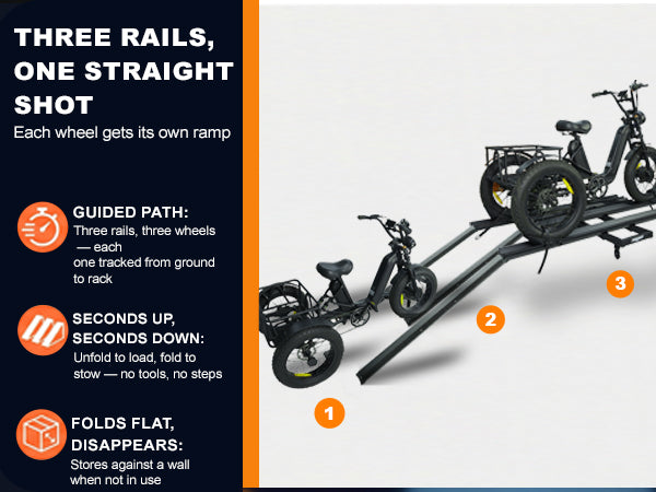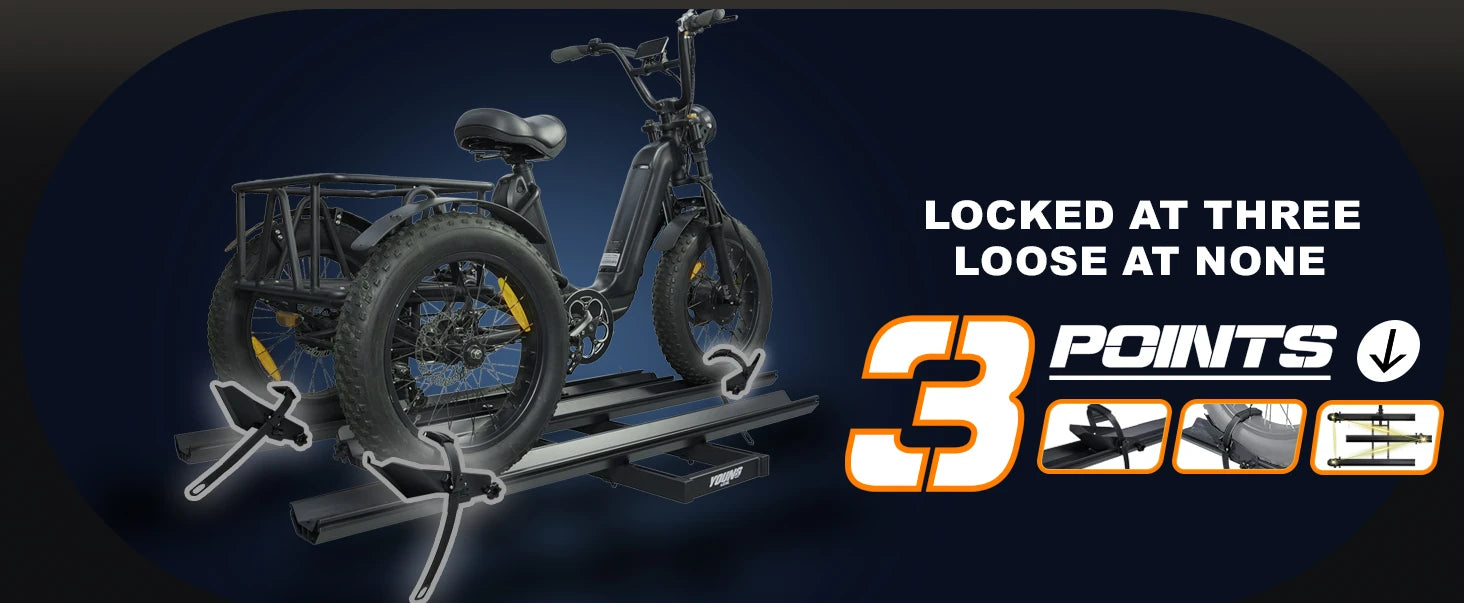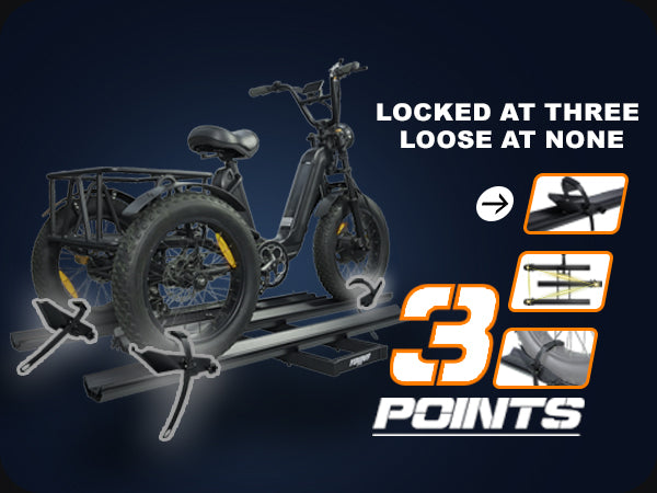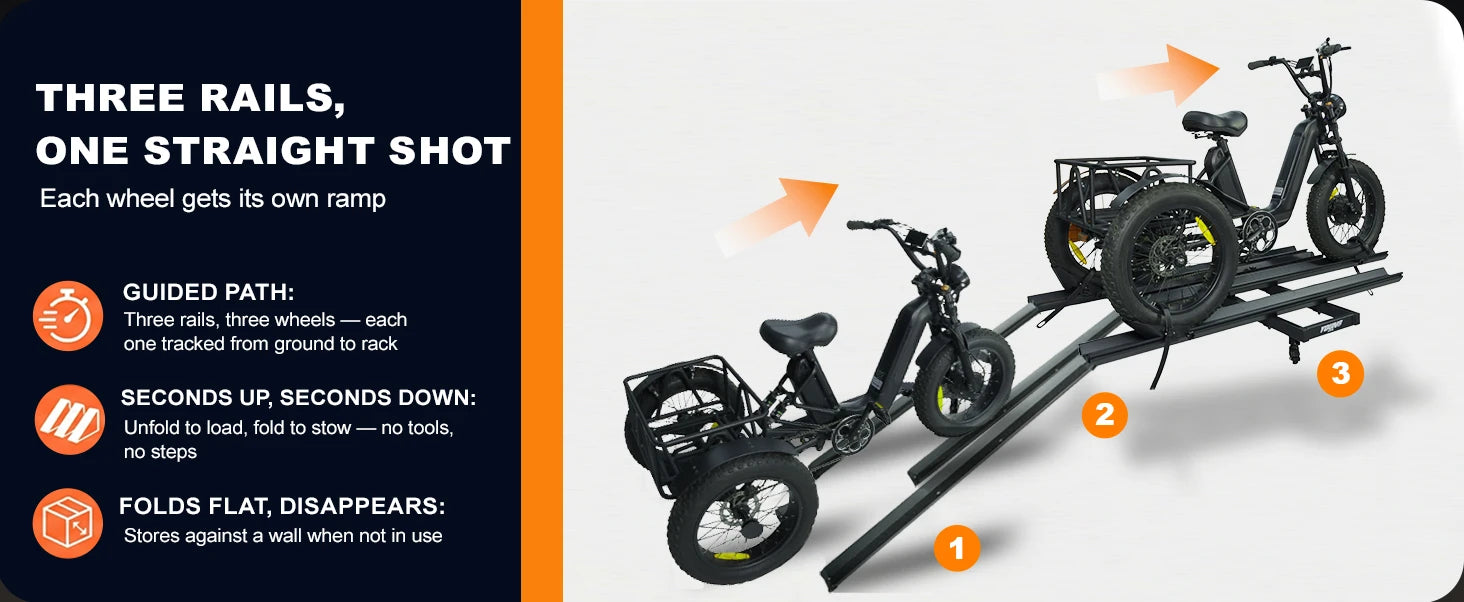 3pcs Loading Ramp for Effortless Loading -- Comes with three integrated ramps, the electric trike rack allows you to roll your trike onto the rack directly without heavy lifting. Easy single-person loading and unloading, saving time and physical effort during transportation.