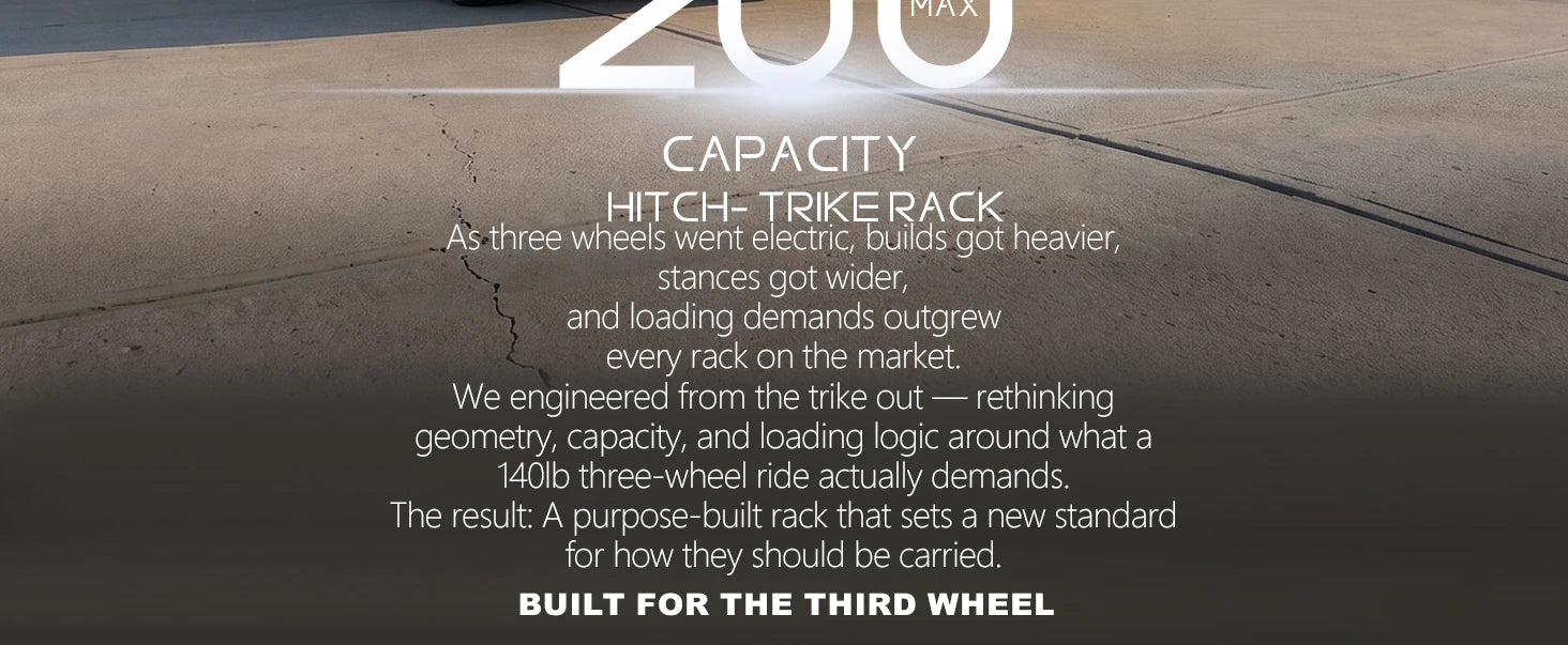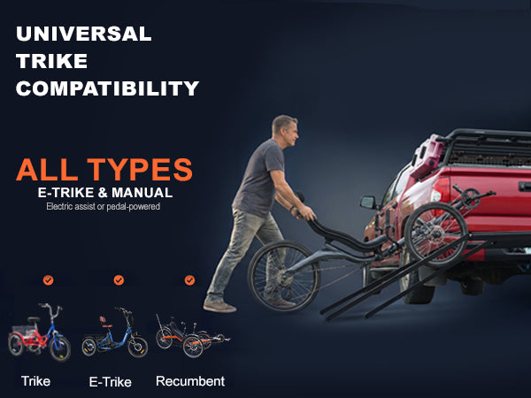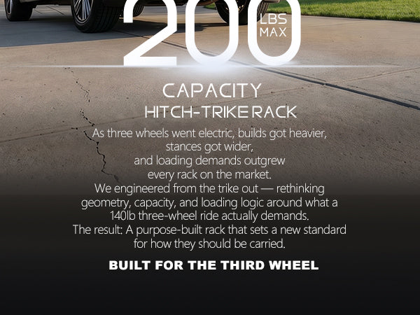 200 LBS Heavy-Duty Capacity -- This trike bike rack is specially designed for electric trikes, this reinforced hitch bike rack for adult tricycle features a 200 lbs maximum load capacity. Crafted from premium steel and aluminum structure for outstanding sturdiness, anti-rust performance and long-lasting outdoor durability.